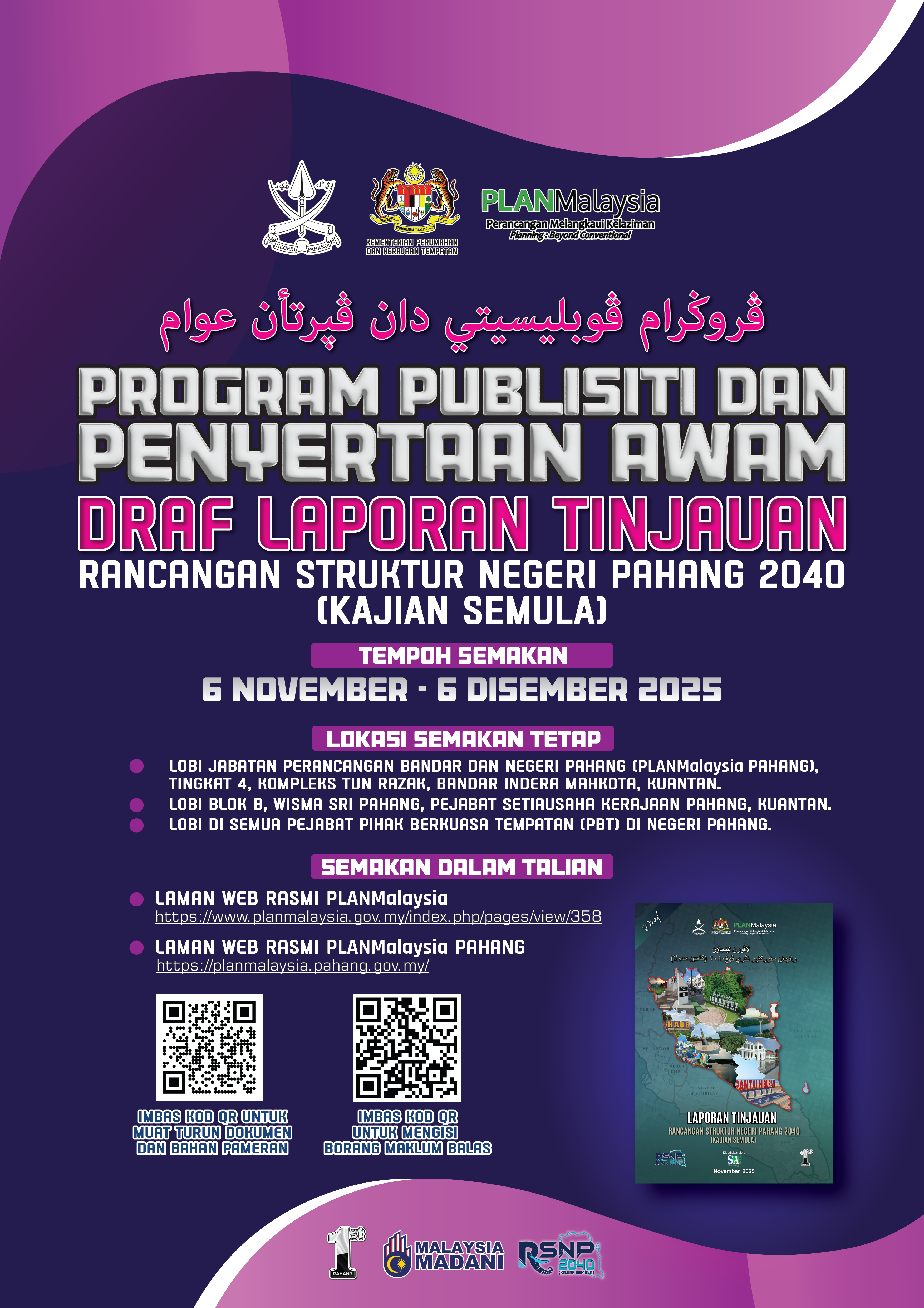 1. | Draf Laporan Tinjauan, Rancangan Struktur Negeri Pahang 2040 (Kajian Semula) | |