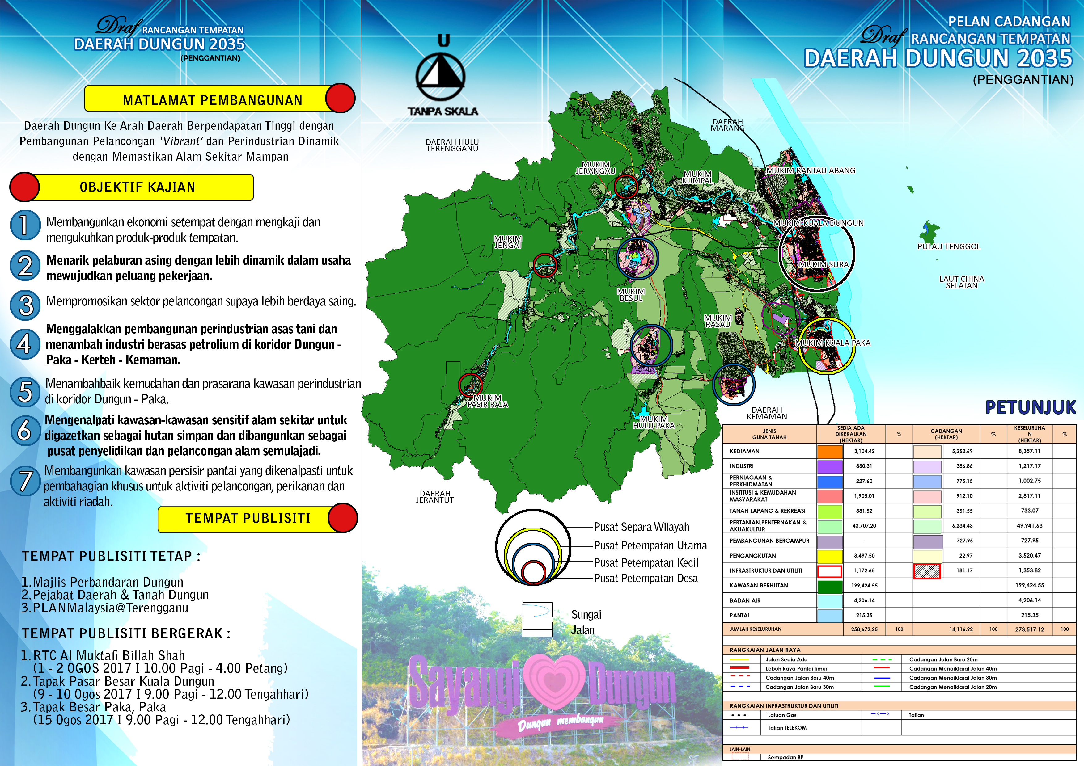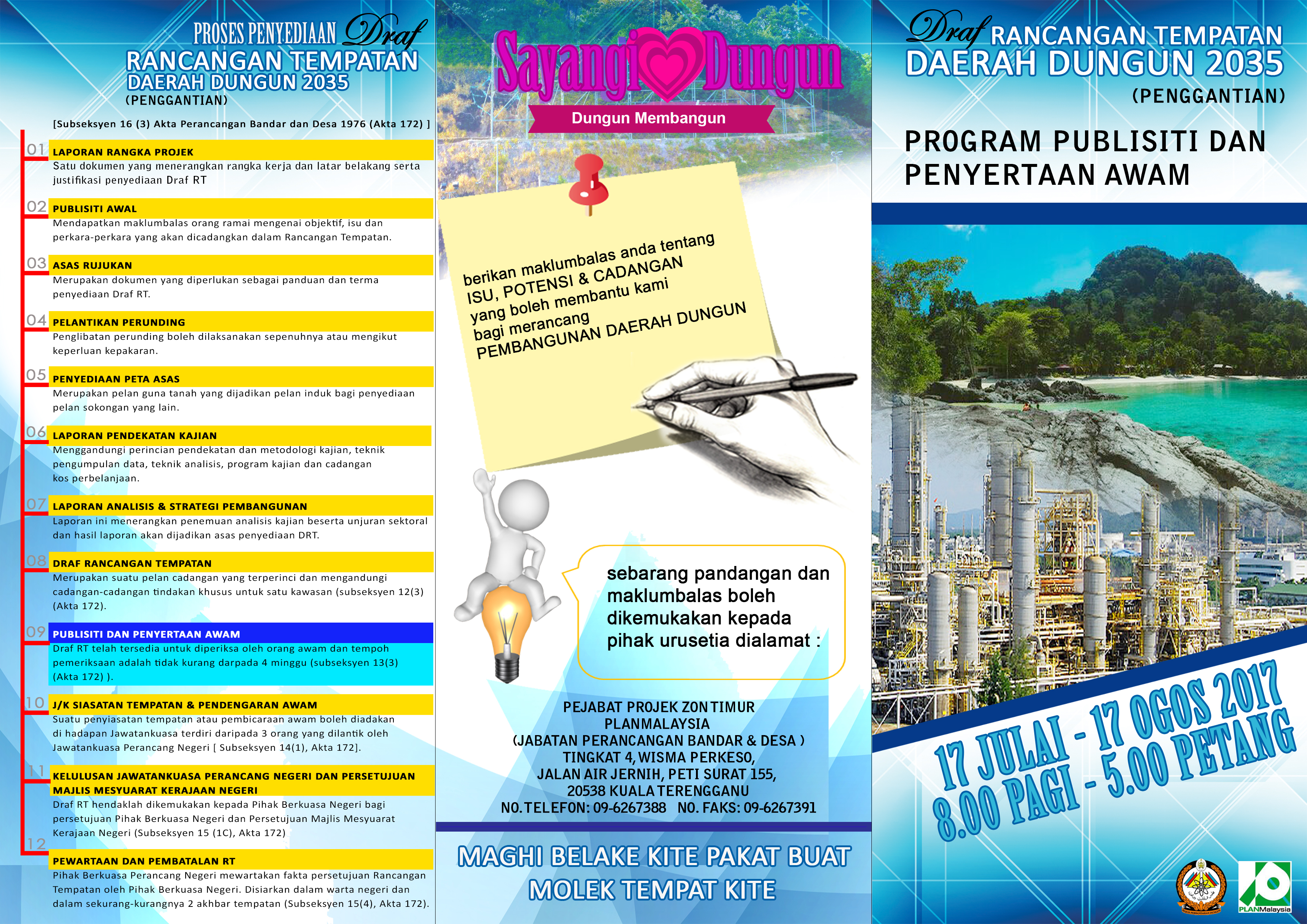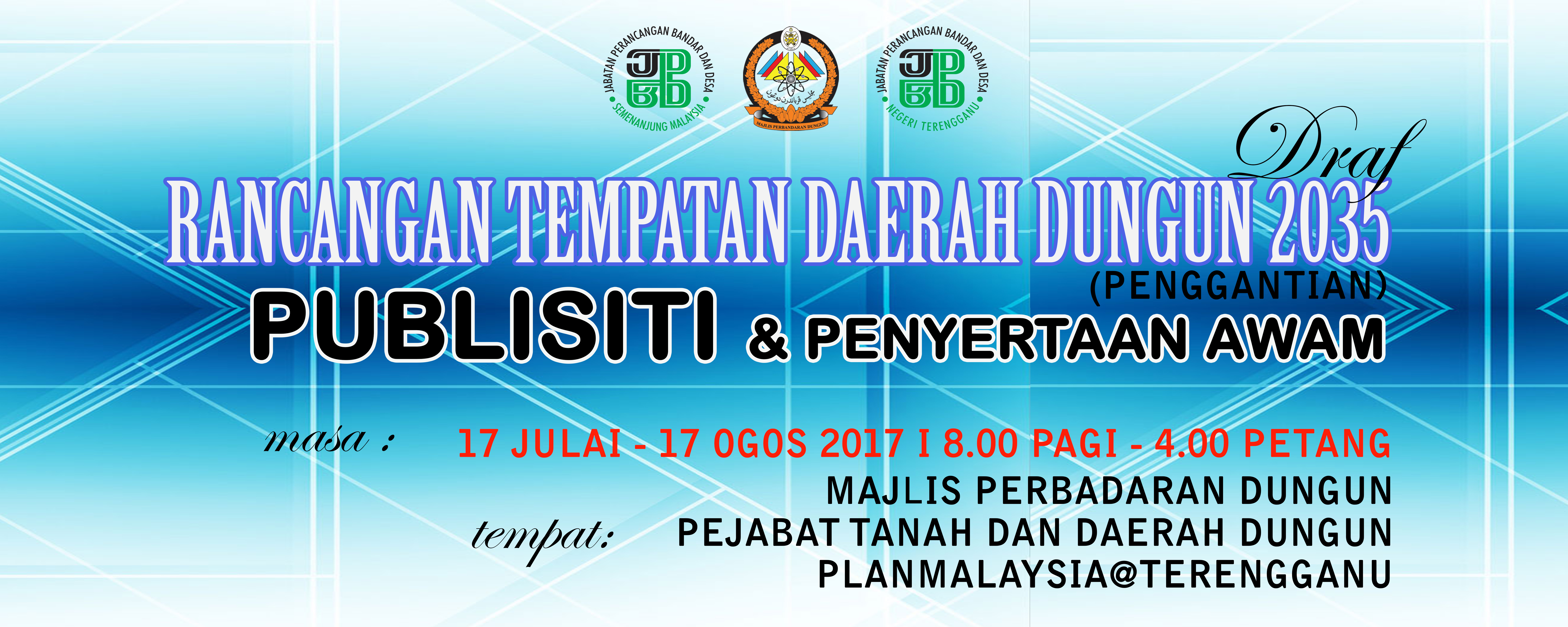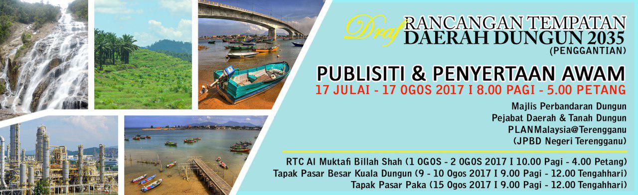 Draf Rancangan Tempatan Daerah Dungun 2035 (Penggantian) ini disediakan dengan peruntukan Seksyen 16(1) Akta Perancangan Bandar dan Desa 1976 (Akta 172). Dokumen ini merupakan satu-satunya dokumen perancangan yang akan digunakan secara sah sebagai mekanisme perancangan Rancangan Rempatan yang menyatakan semua cadangan pembangunan tanah dan fizikal yang terperinci. | ||||||||||||||||||||||||
