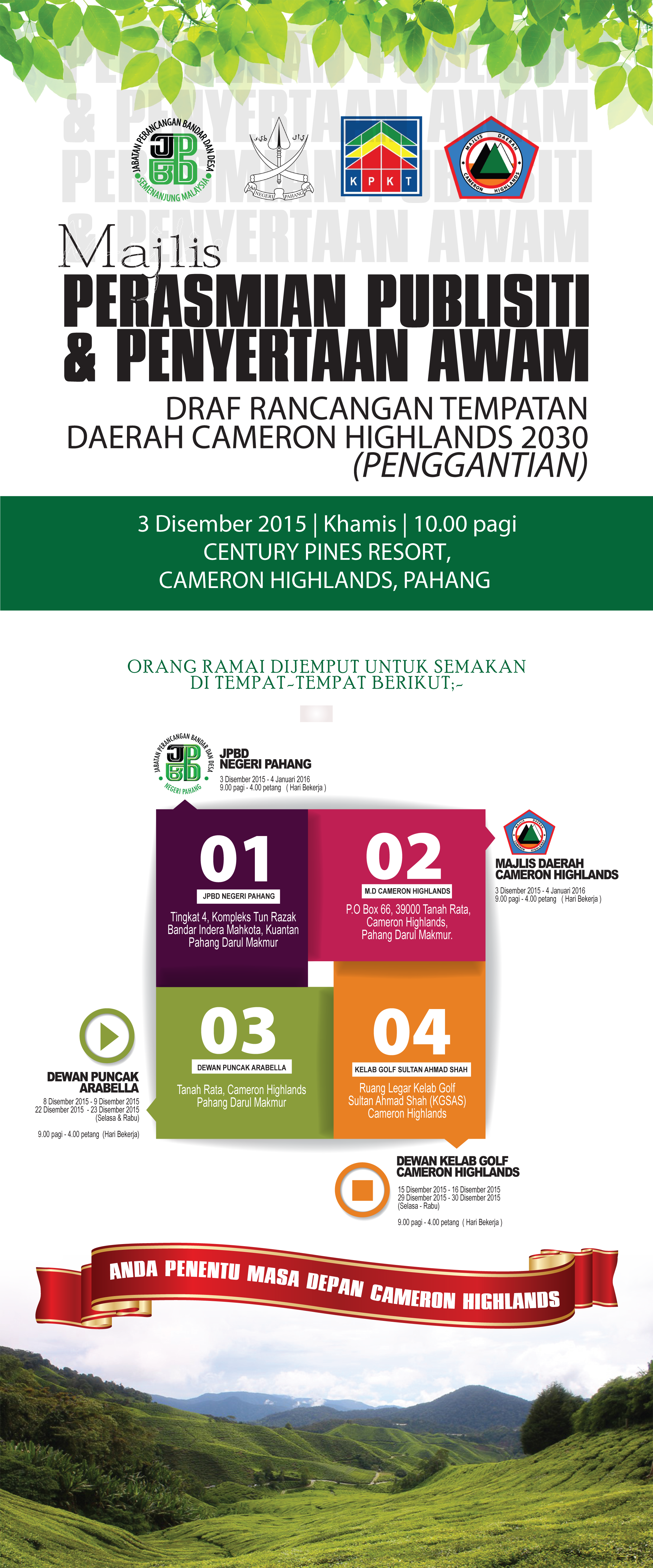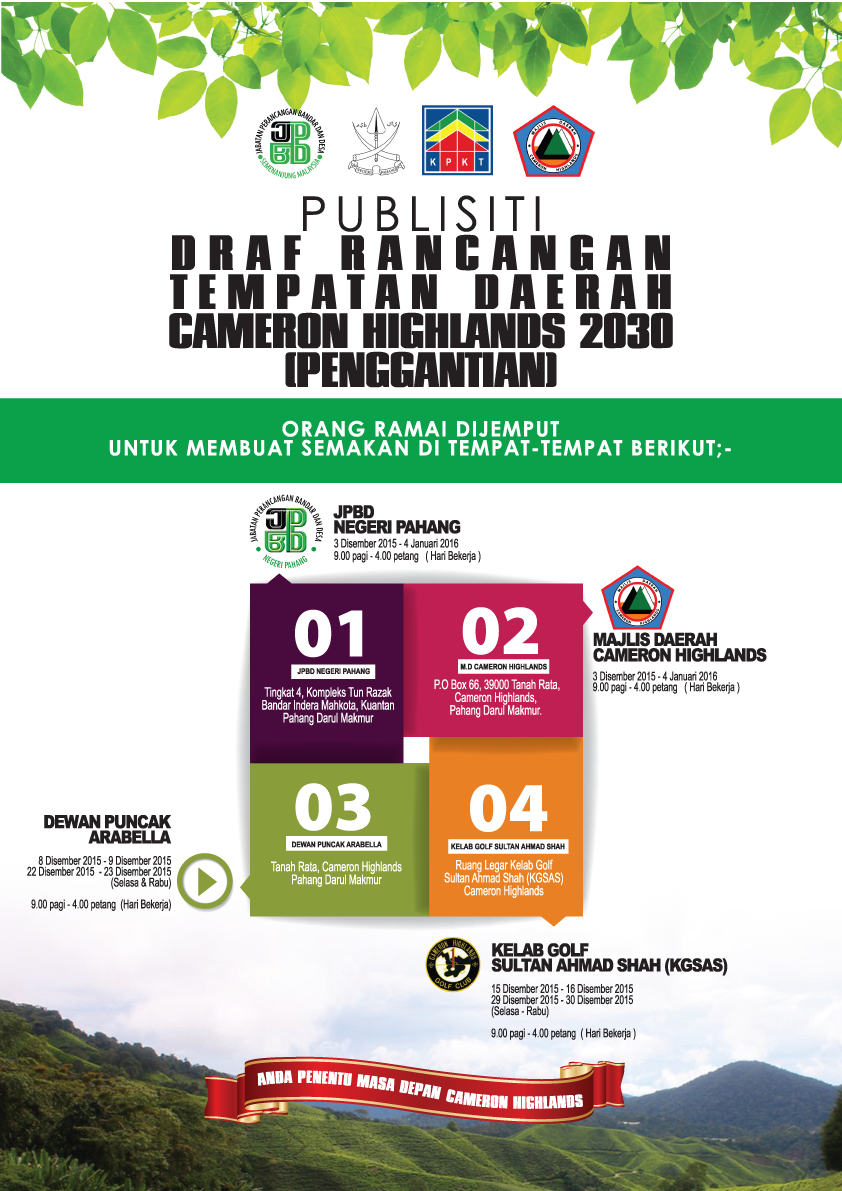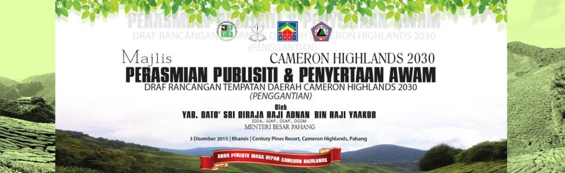 Risalah ini ialah ringkasan Laporan Draf Rancangan Tempatan Daerah Cameron Highlands 2030. Ia menerangkan cadangan-cadangan pembangunan di dalam daerah Cameron Highlands. Di samping itu, mekanisme kawalan pembangunan disediakan bagi membantu proses pembangunan di Cameron Highlands pada masa depan. Segala perincian mengenai rancangan ini hendaklah merujuk kepada laporan draf rancangan tersebut. KEPERLUAN PENGGANTIAN RANCANGAN TEMPATAN DAERAH CAMERON HIGHLANDS Terdapat beberapa isu pembukaan dan pembangunan tanah secara tidak sah dan di luar dari zon cadangan guna tanah yang dibenarkan. Kejadian tanah runtuh dan banjir kilat yang mengakibatkan kehilangan nyawa dan harta benda seperti mana yang berlaku pada 21 November 2014. Isu-isu kesesakan lalulintas, aktiviti perniagaan tidak formal, kemerosotan kualiti visual, rekabentuk bandar dan sebagainya perlu diatasi. Pengesyoran oleh YAB. Tan Sri Pengerusi pada Mesyuarat Khas Bencana Banjir Kilat dan Tanah Runtuh pada 24 November 2014 untuk penyediaan RT bagi memulihkan semula Daerah Cameron Highlands sebagai destinasi pelancongan tanah tinggi negara adalah bertepatan dengan keperluan Akta Perancangan Bandar dan Desa 1976 9Akta 172). | ||||||||||||||||||||||||||||||