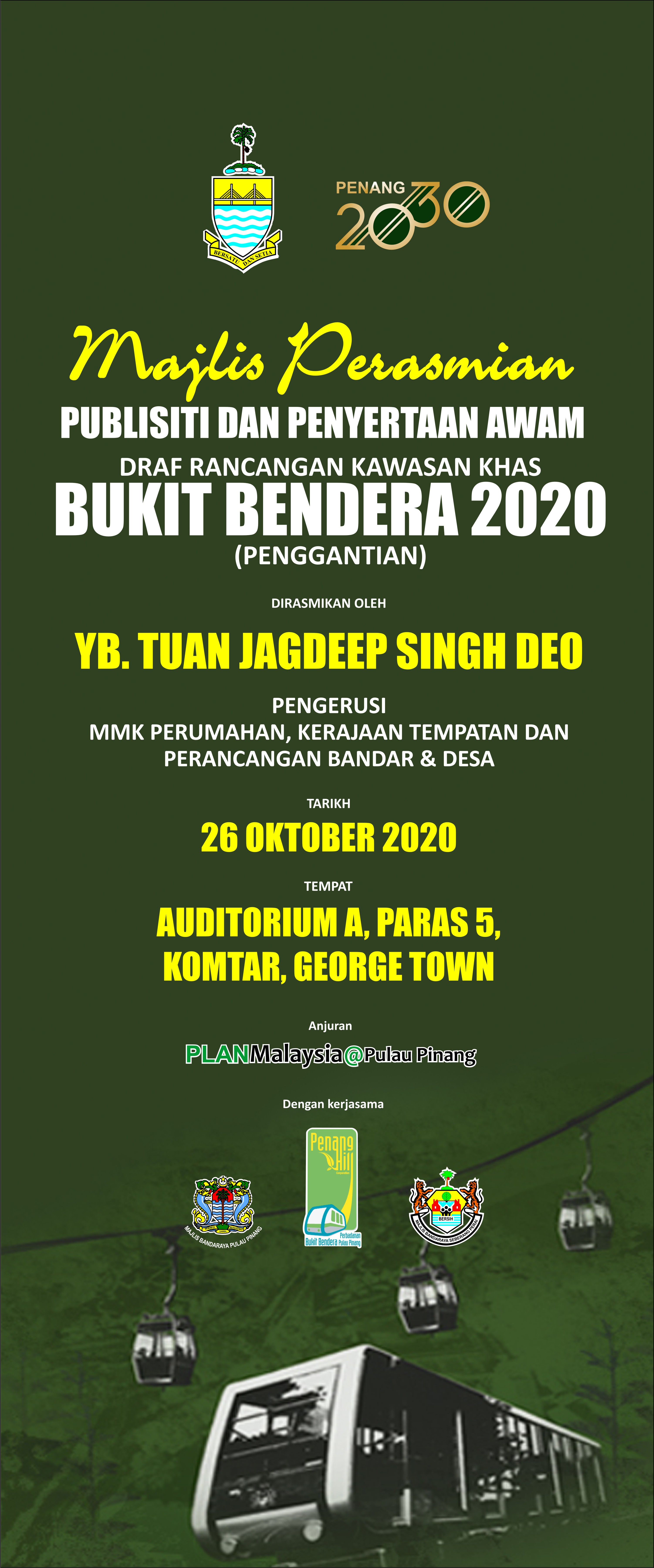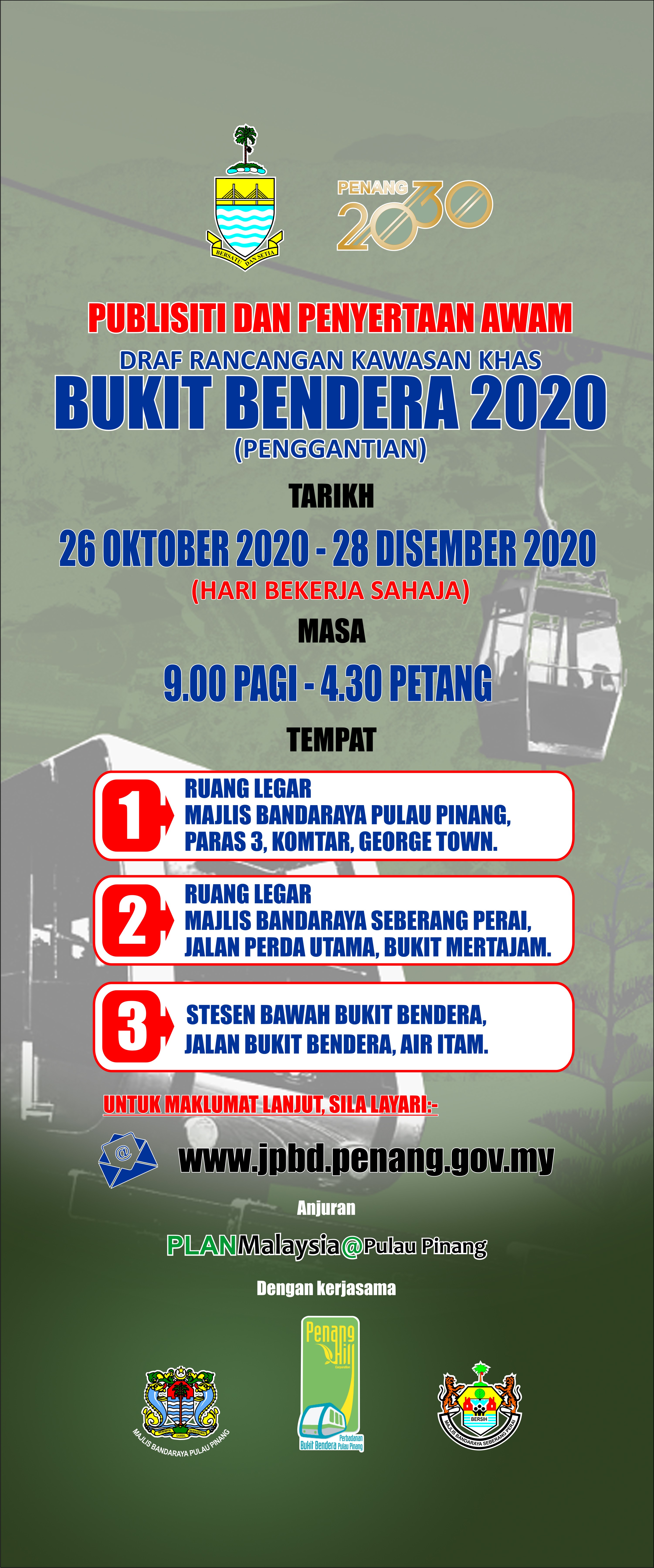 Sukacita dimaklumkan Mesyuarat Jawatankuasa Perancang Negeri Bil. 7/2020 pada 28 September 2020 telah meluluskan Kertas Kerja Program Publisiti dan Penyertaan Awam bagi Draf Laporan Rancangan Kawasan Khas Bukit Bendera (RKK BB) 2020 (Penggantian). Program ini akan bermula pada 26 Oktober 2020 sehingga 28 Disember 2020 (2 bulan).