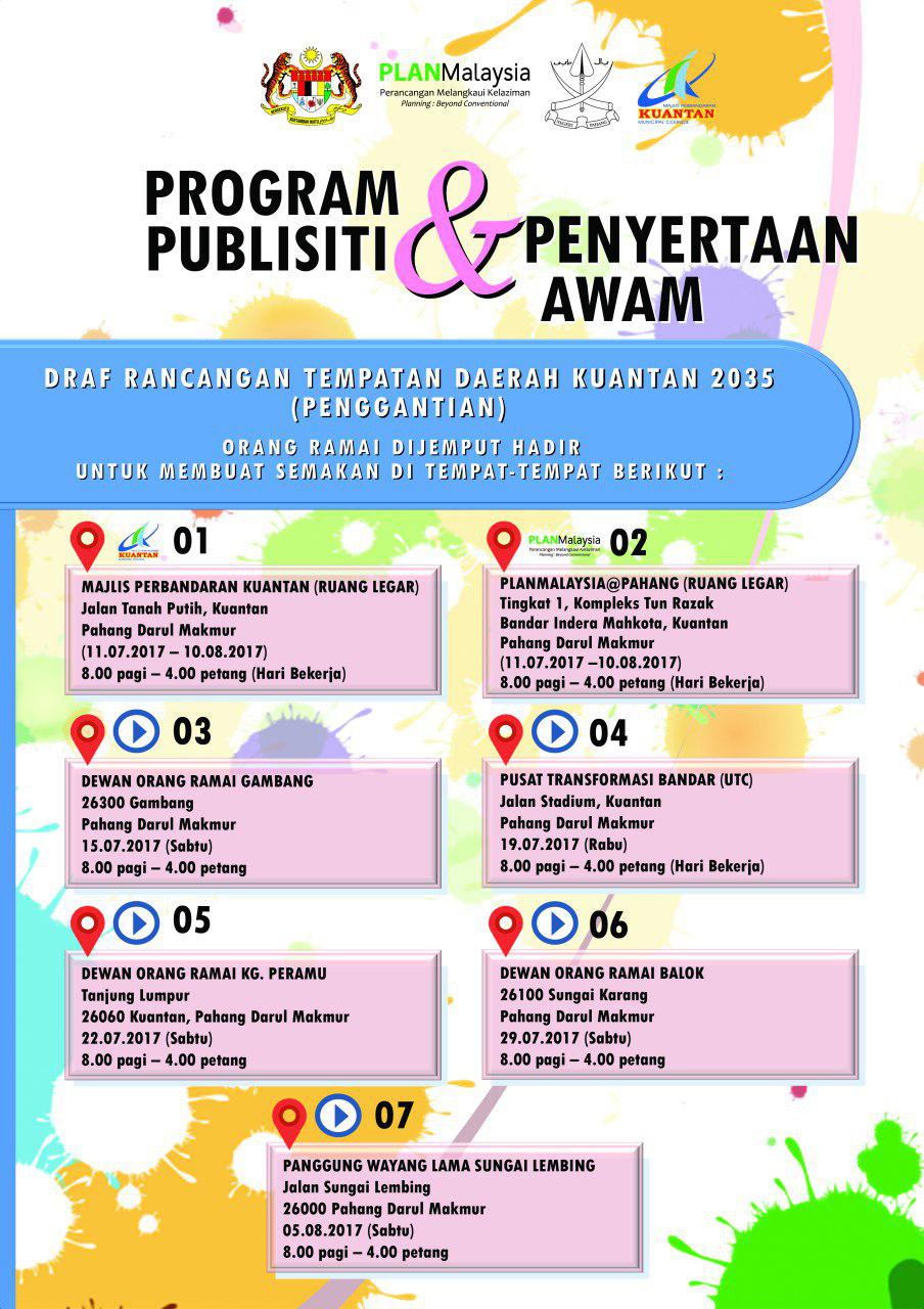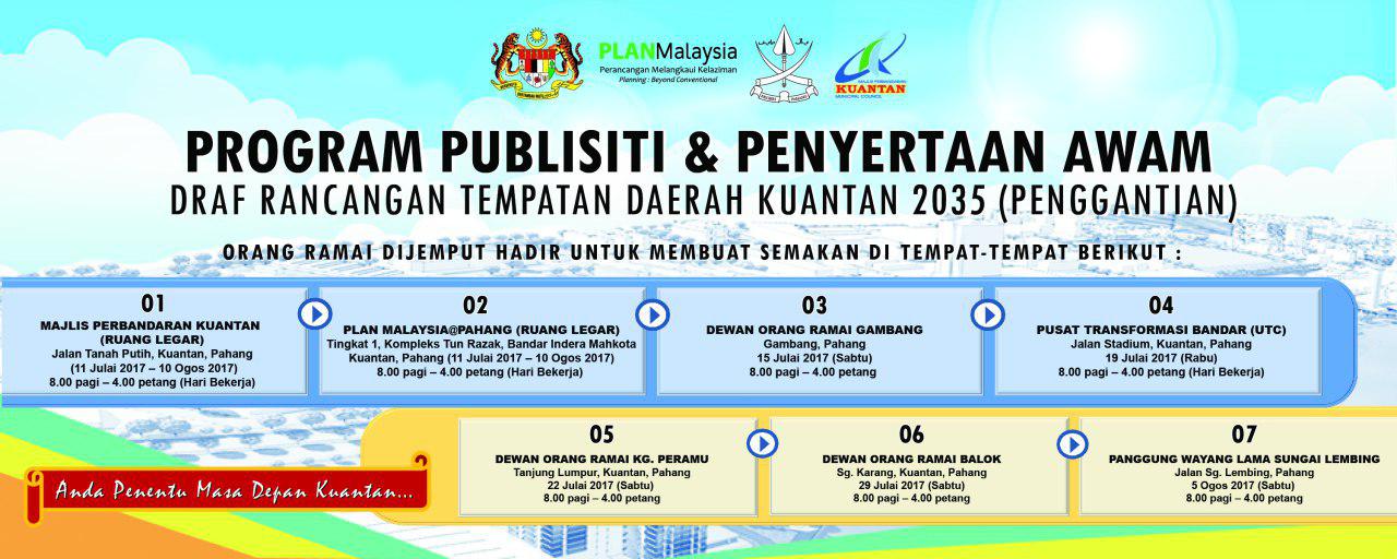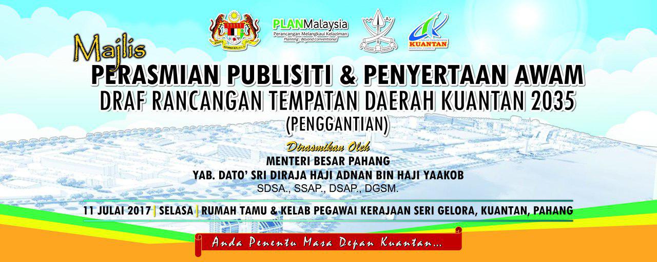 Draf Rancangan Tempatan Daerah Kuantan 2035 (Penggantian) ini disediakan dengan peruntukan Seksyen 16(1) Akta Perancangan Bandar dan Desa 1976 (Akta 172). Dokumen ini merupakan satu-satunya dokumen perancangan yang akan digunakan secara sah sebagai mekanisme perancangan Rancangan Rempatan adalah dokumen yang menyatakan semua cadangan pembangunan tanah dan fizikal yang terperinci. | |||||||||||||||||||||||||||||||||