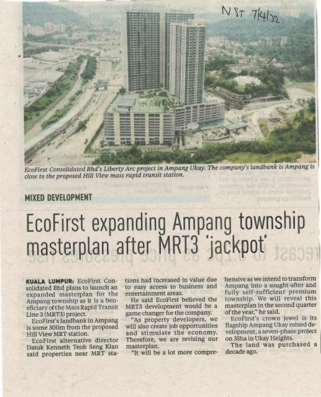 ECOFIRST EXPENDING AMPANG TOWNSHIP MASTERPLAN AFTER MRT3 'JAKPOT' - NST (7 APRIL 2022)
