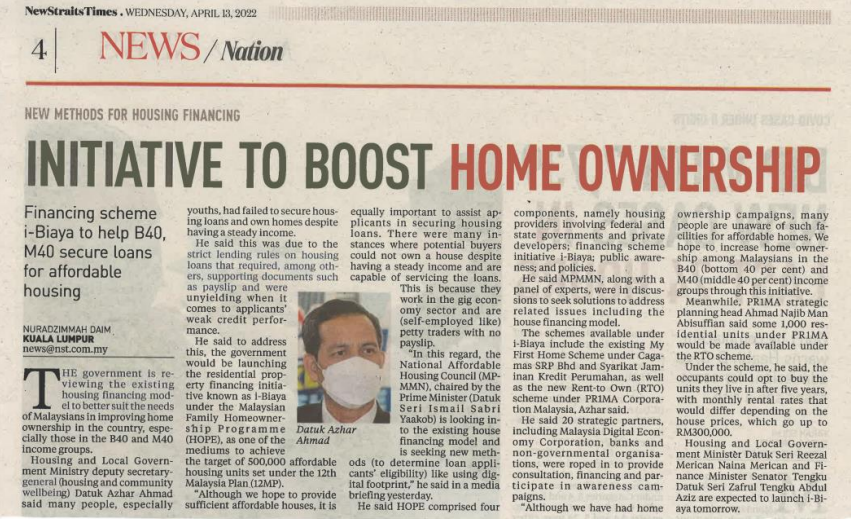 INITIATIVE TO BOOST HOME OWNERSHIP - NST (13 APRIL 2022)