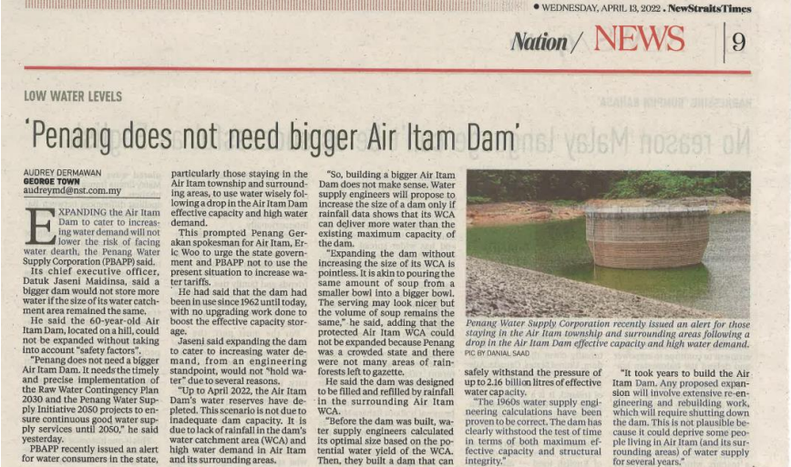 PENANG DOES NOT NEED BIGGER AIR ITAM DAM- NST (13 APRIL 2022)