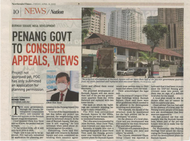 PENANG GOVT TO CONSIDER APPEALS, VIEWS - UTUSAN (15 APRIL 2022)