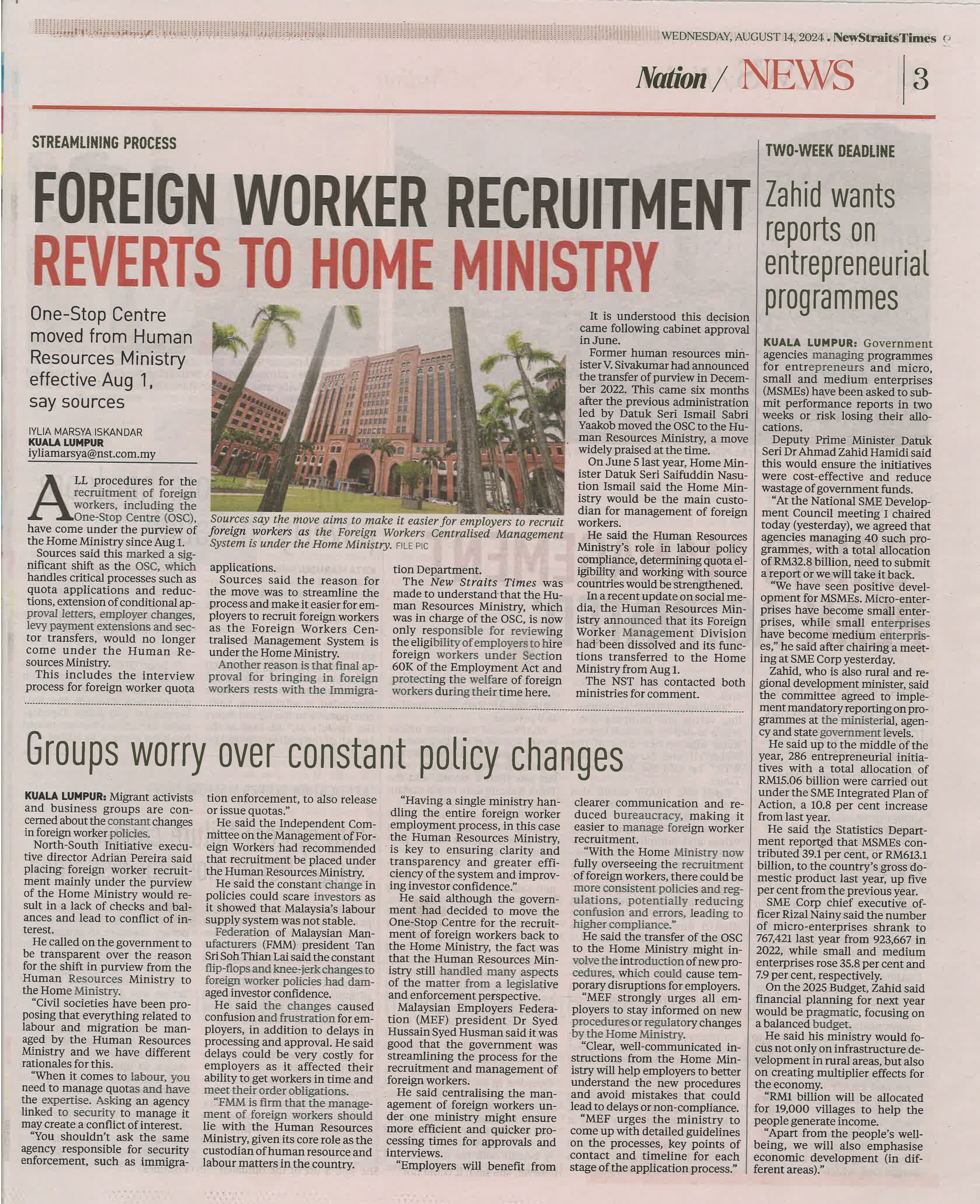 FOREIGN WORKER RECRUITMENT REVERTS TO HOME MISISTRY