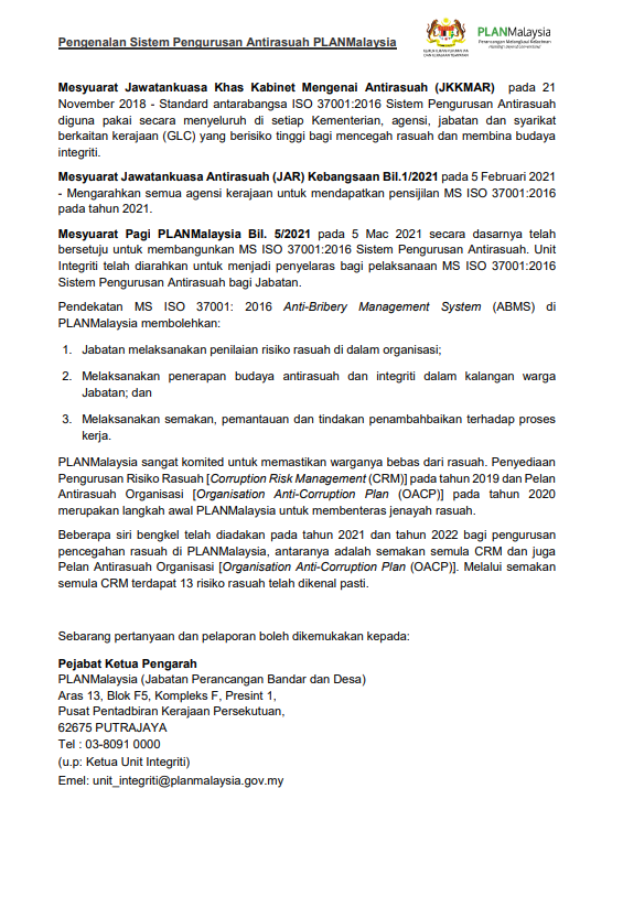 Untuk makluman lanjut, klik Disini Pengenalan SISTEM ADUAN TATAKELAKUAN & RASUAH PLANMALAYSIA (SATRA);